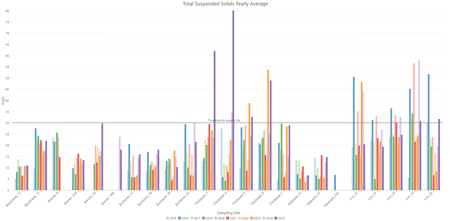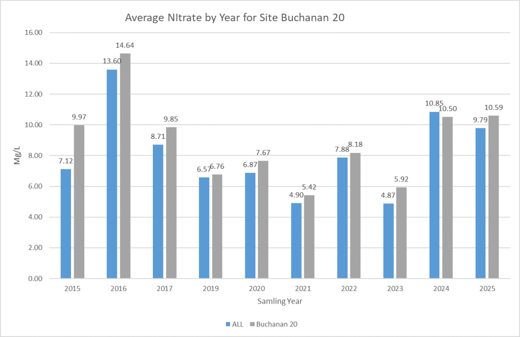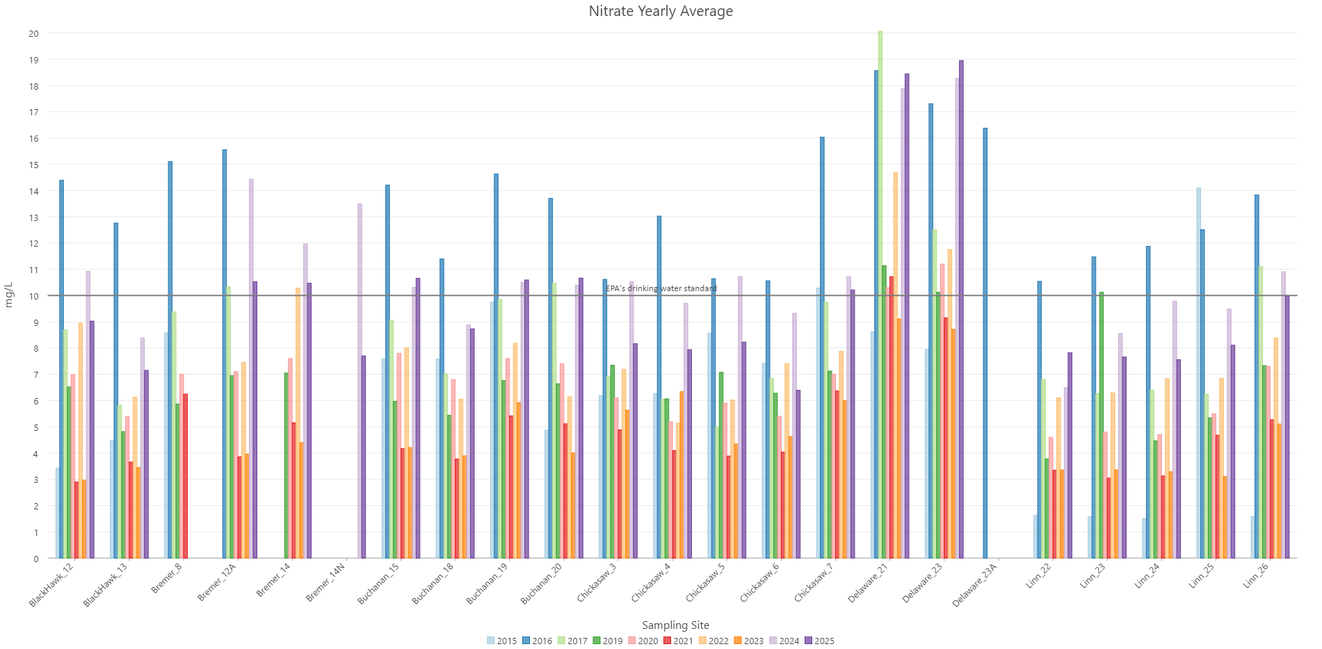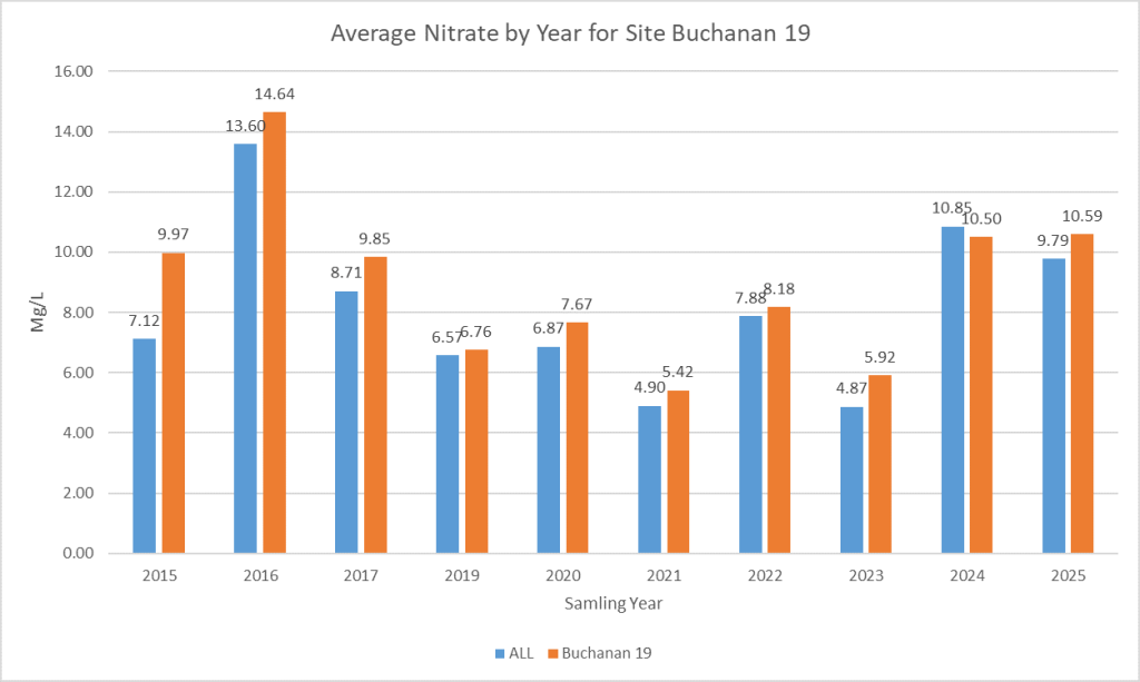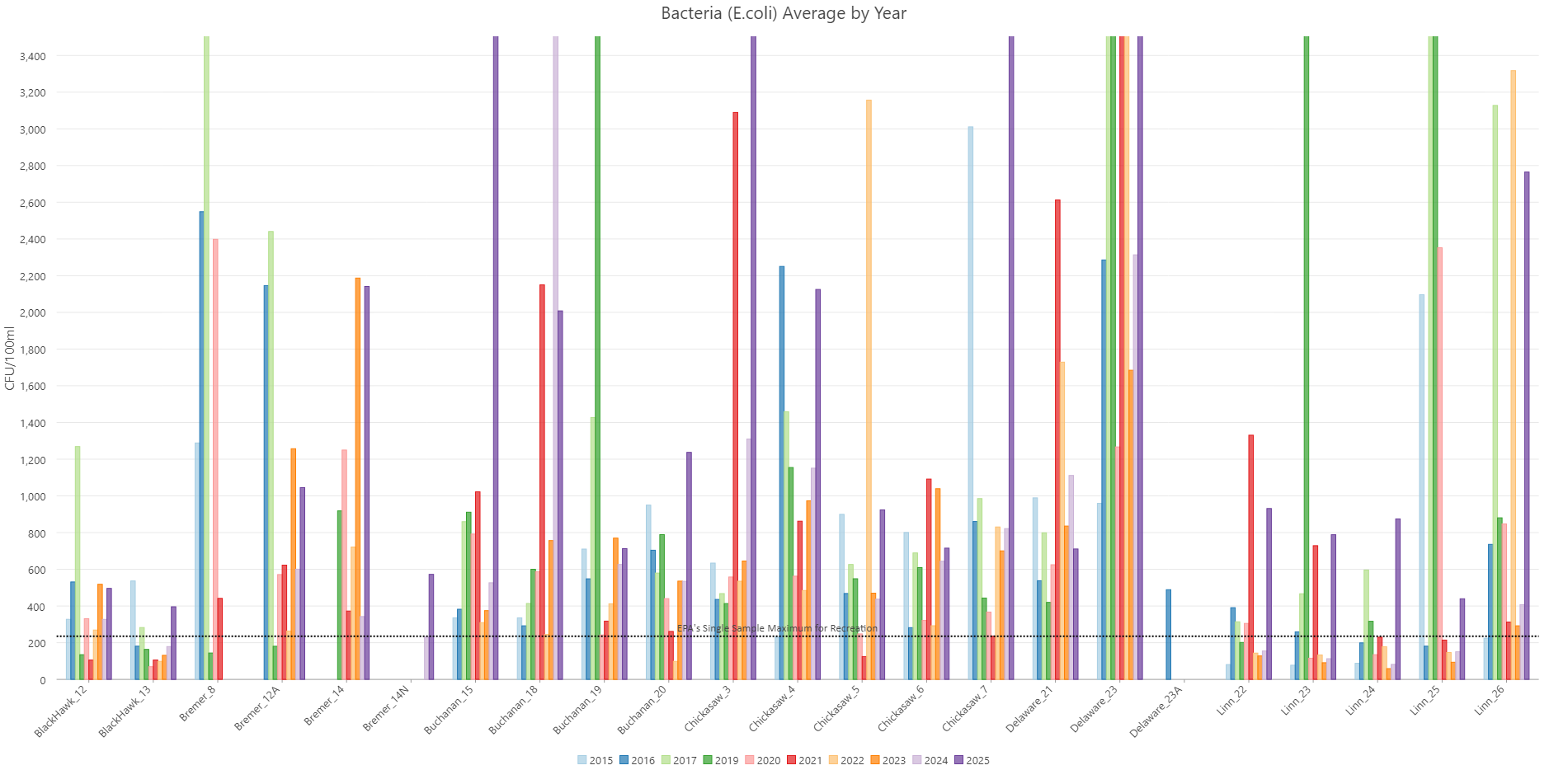 The Upper Wapsipinicon River Watershed is fairly new to surface water quality monitoring at the whole watershed scale. The Upper Wapsipinicon River Watershed Management Authority started water sampling with the help from partner organizations in 2015. Since then, samples were gathered in 2016, 2017, and currently in 2019. Due to lack of funding and volunteers no samples were collected during the 2018 season. Currently in 2019, samples are collected twice a month during May and June (on the first and third Monday of the month) and once a month (on the third Monday) from July to October. Samples are gathered from 22 locations across the UWRW. This data provides a snapshot of the entire watershed on a given day each month and allows the comparison of one stream/watershed to the next. For example, watersheds of streams in Howard County can then be compared and contrasted with similarly-sized watersheds that empty into the Upper Wapsipinicon 100-miles downstream in Jones County. Water samples are collected on the same day by 7 public and private organizations including, Buchanan SWCD, Buchanan County Conservation, Iowa State Extension, NRCS, Linn County Conservation, Black Hawk County Health Department, and Chickasaw County Conservation. Once samples are gathered they are packed on ice, and sent to the Coe College laboratory for analysis. The samples are analyzed for concentrations of E. coli Bacteria, Nitrate, Total Phosphate as P, Chloride, Sulfate, and Total Suspended Solids.