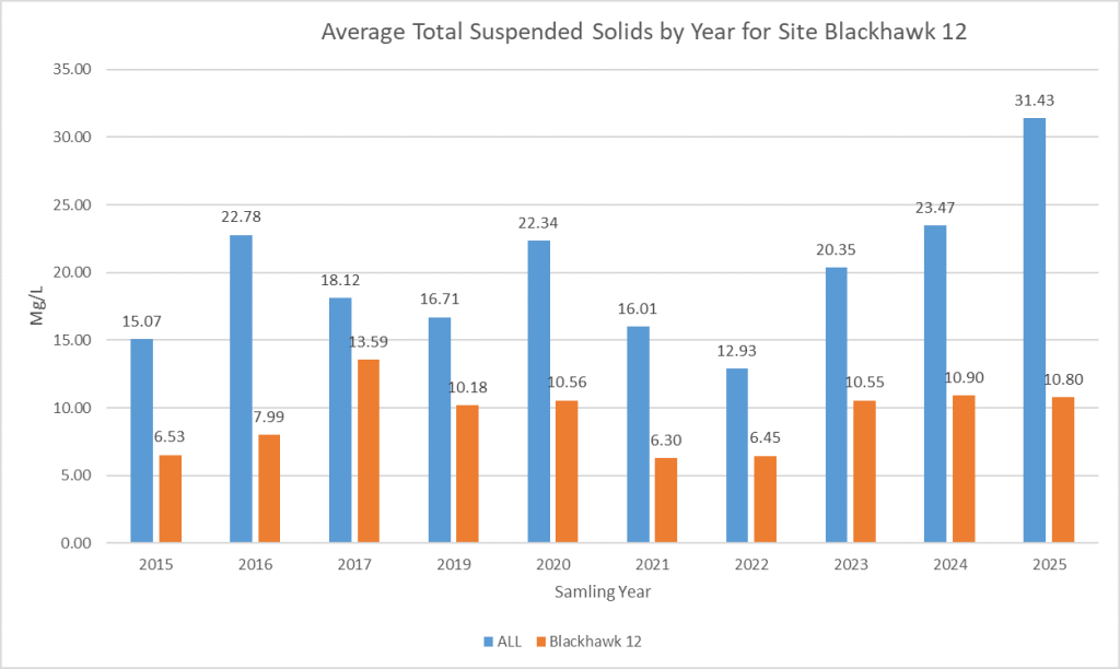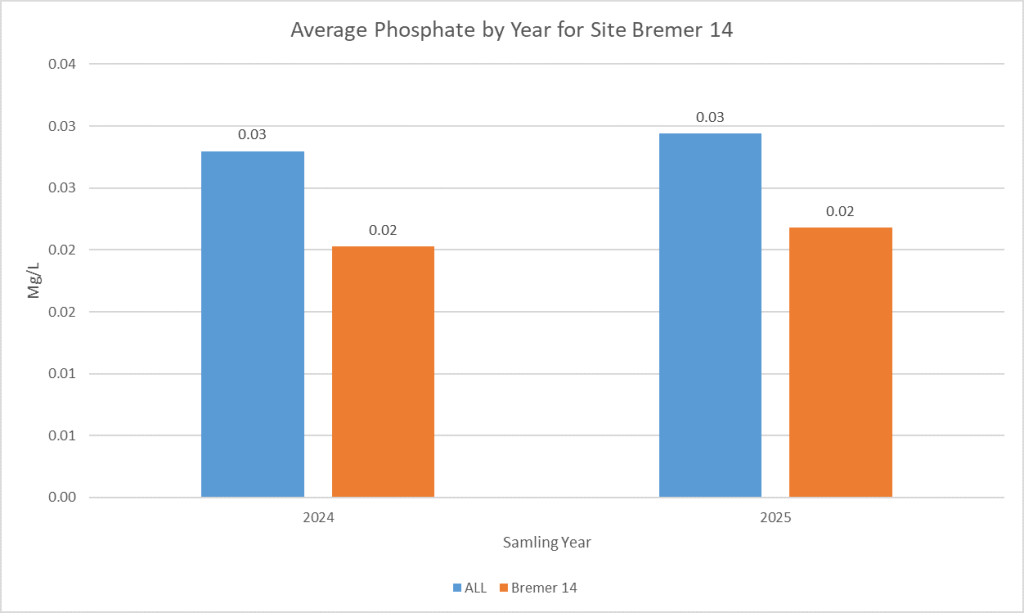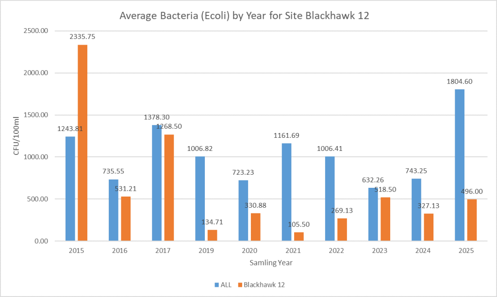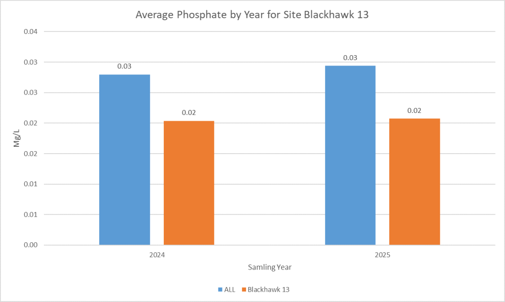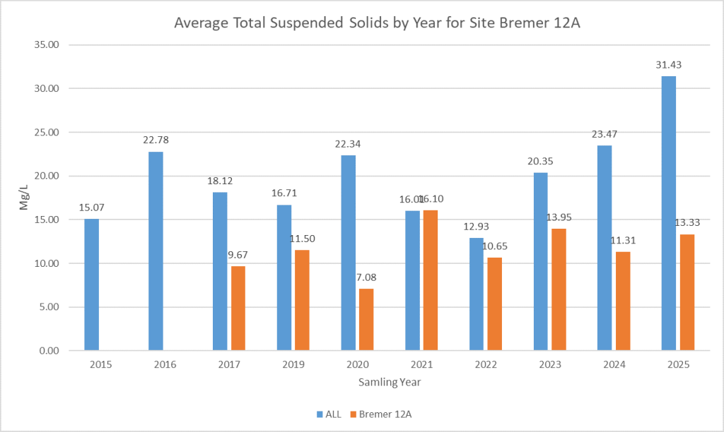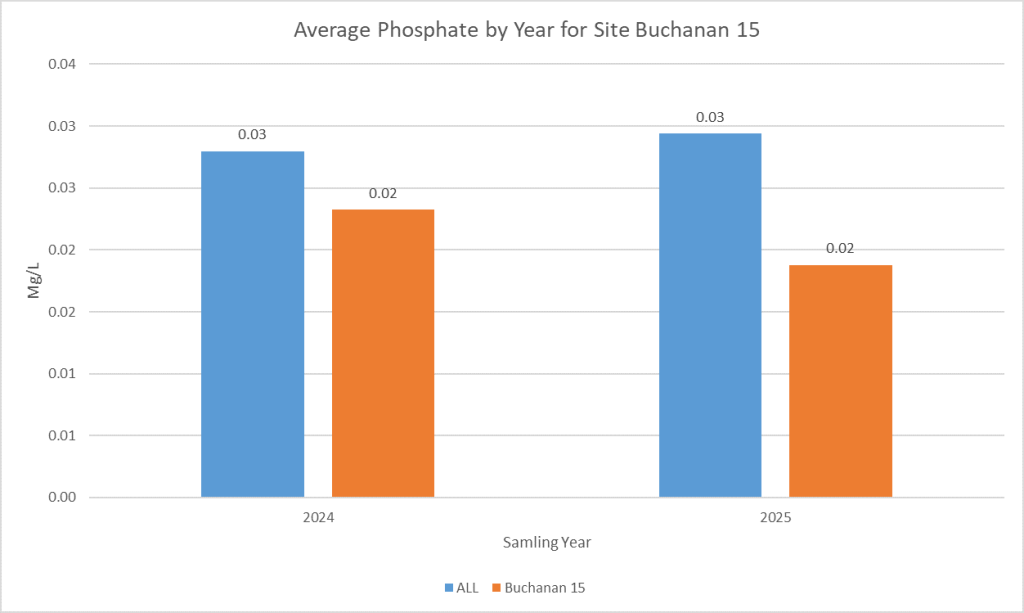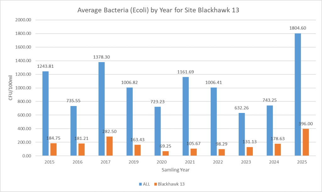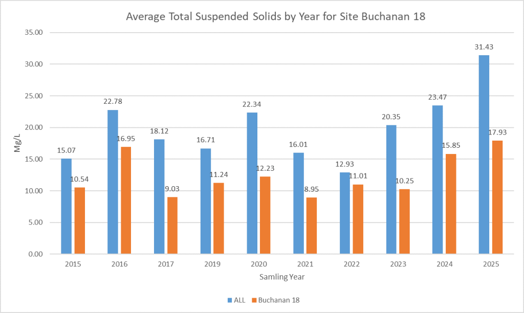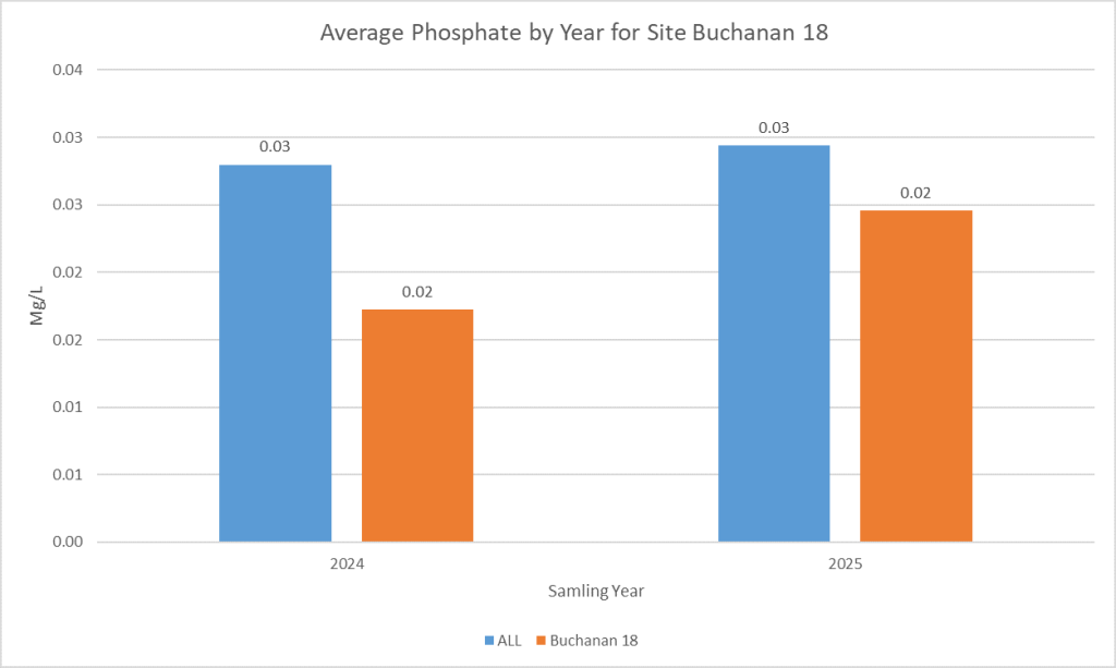 Click on the site of interest to explore nitrate, phosphate, total suspended solids, and bacteria data for that site. The tables associated with each site average results from each sampling year compared to the watershed-wide average.