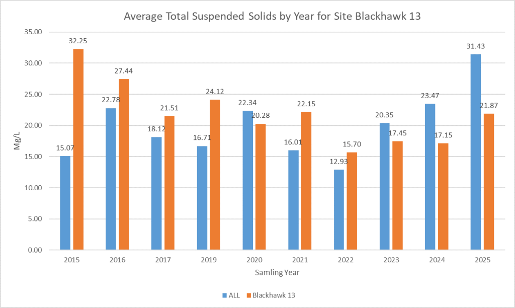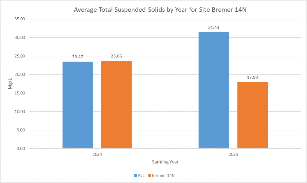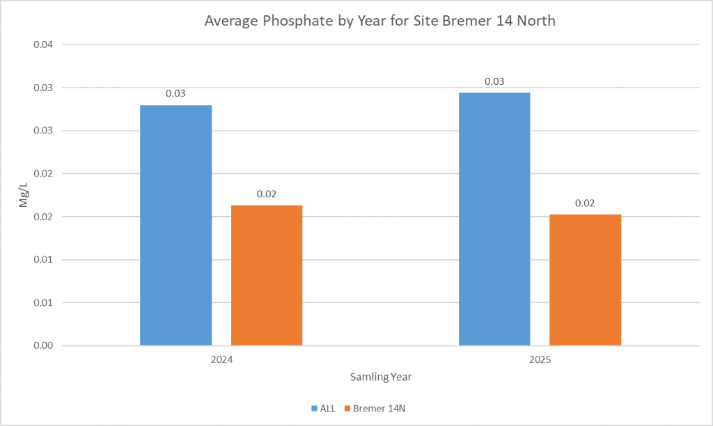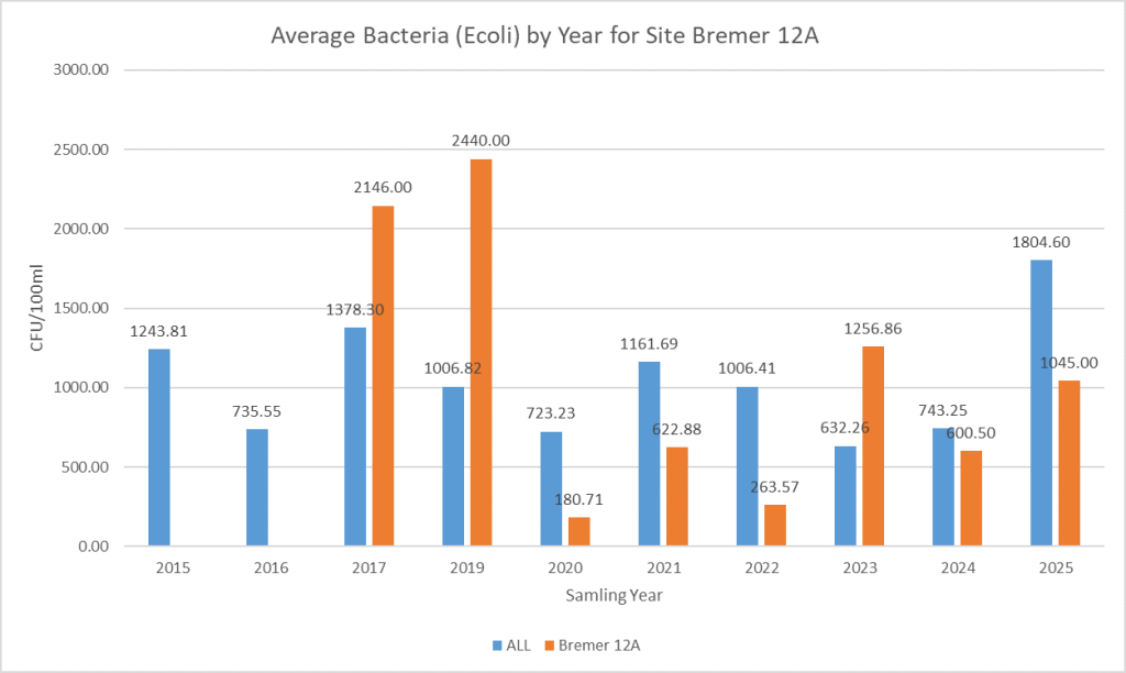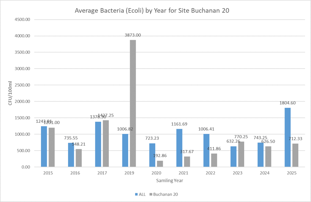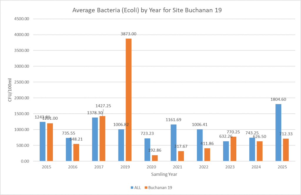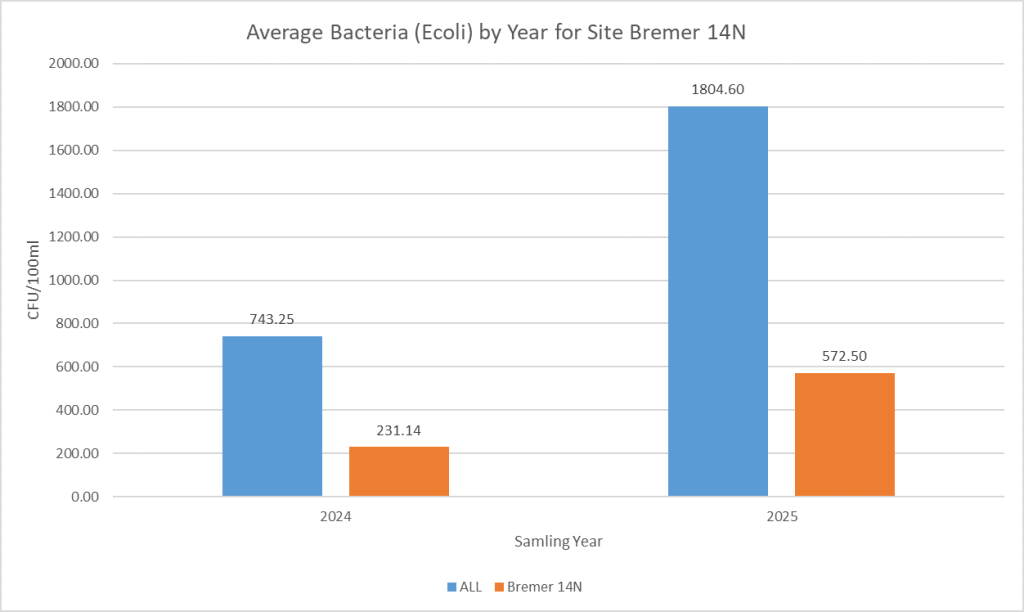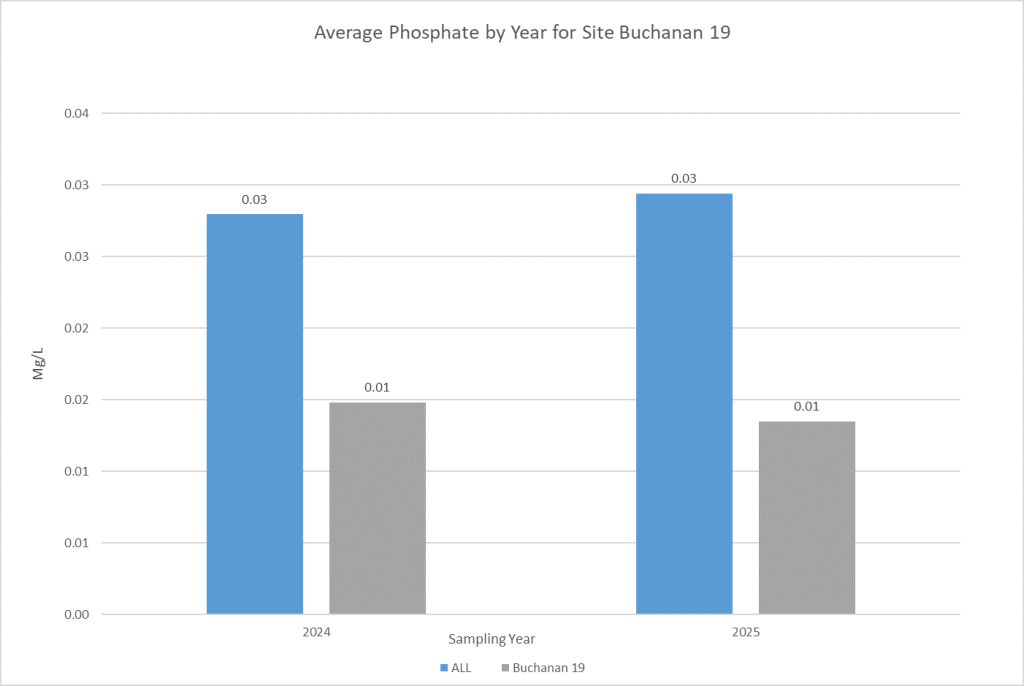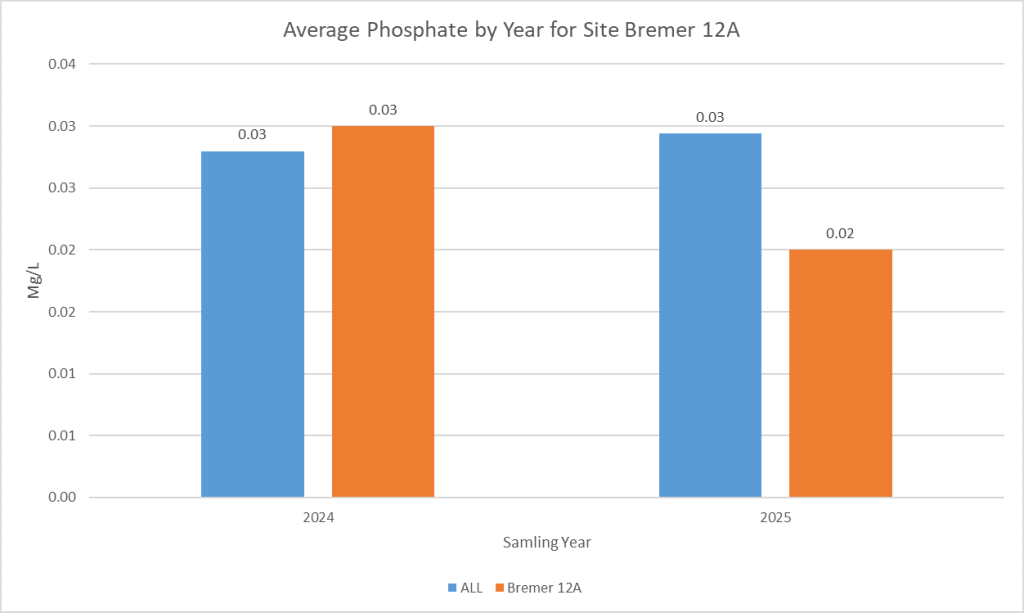 Click on the site of interest to explore nitrate, phosphate, total suspended solids, and bacteria data for that site. The tables associated with each site average results from each sampling year compared to the watershed-wide average.