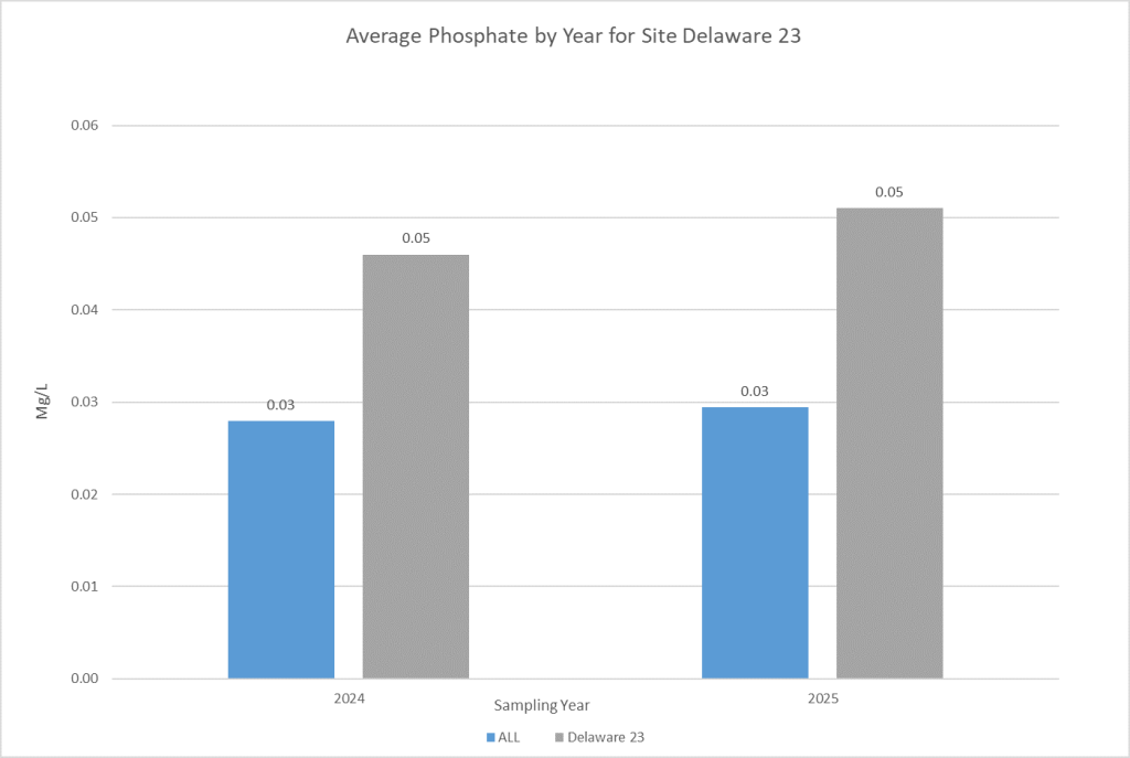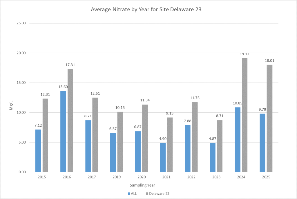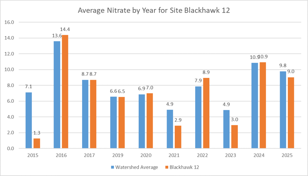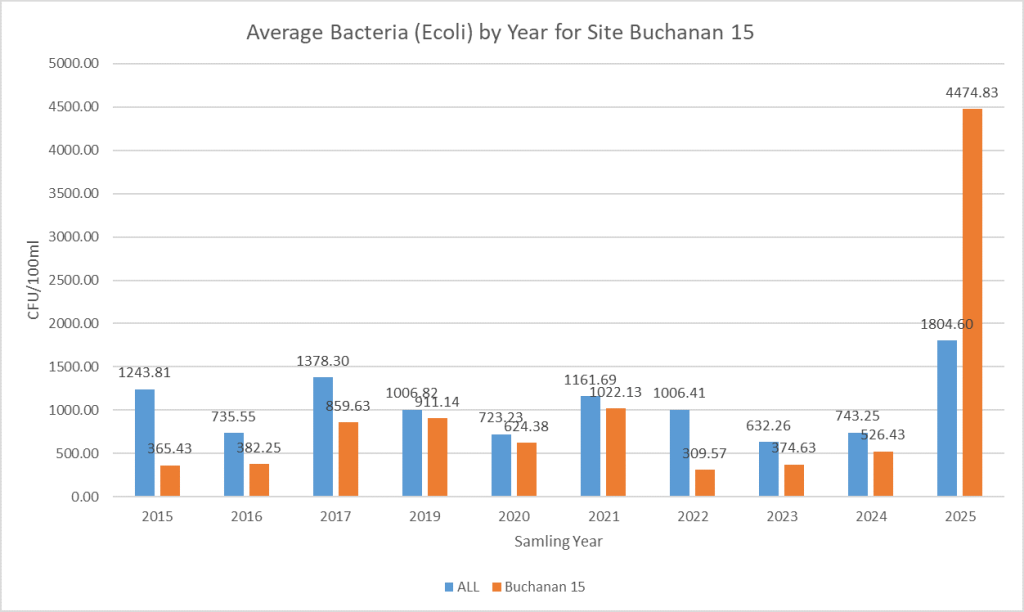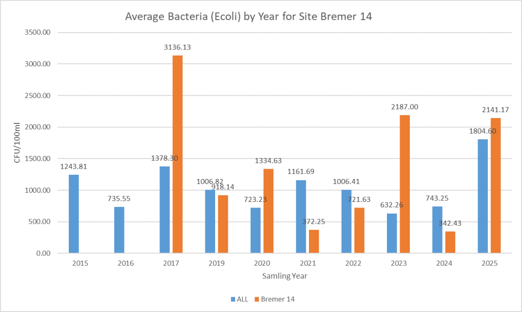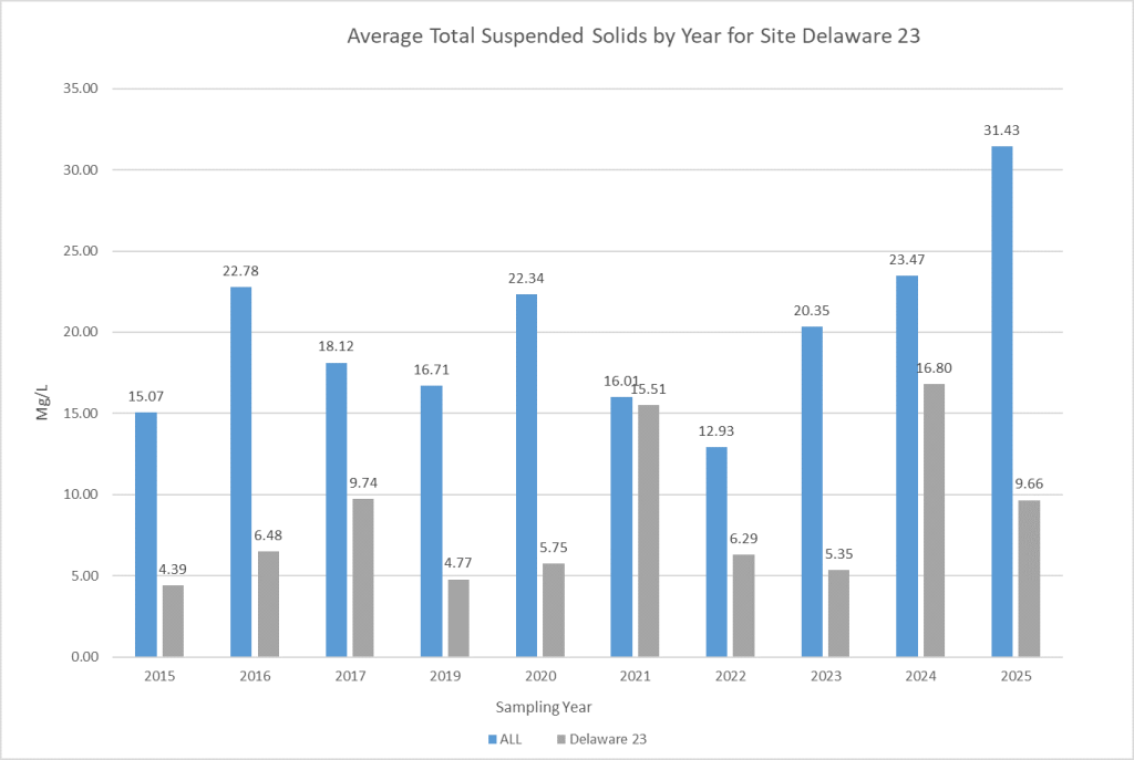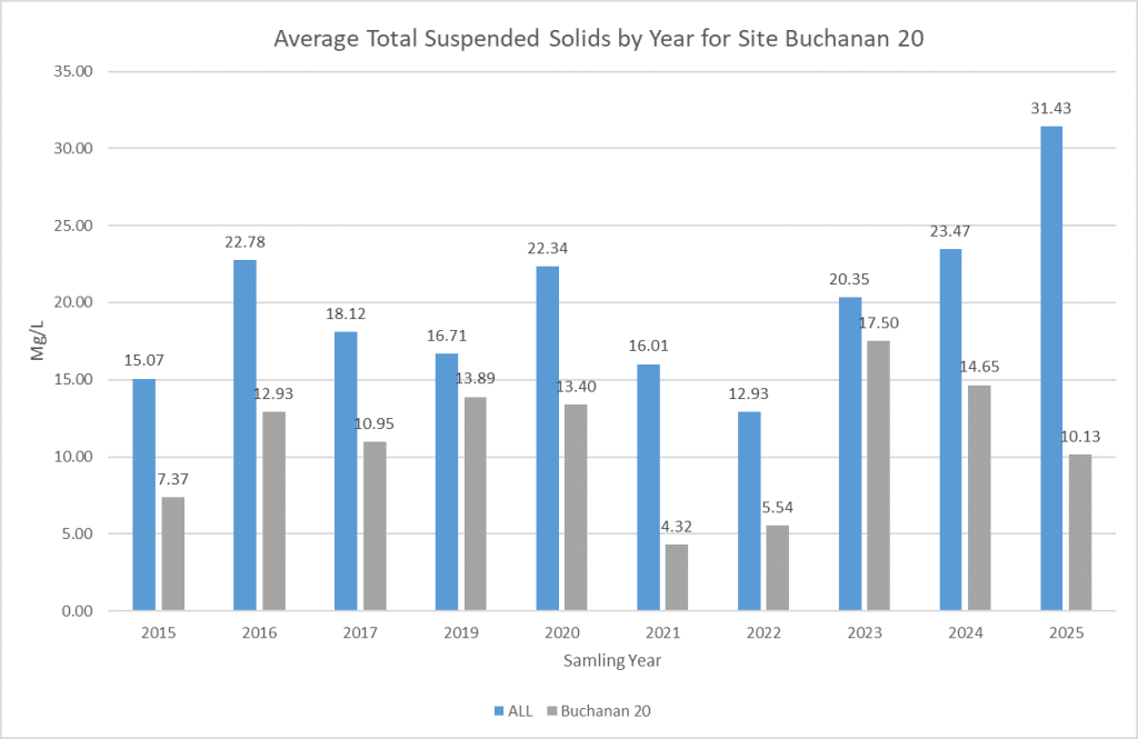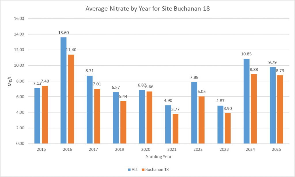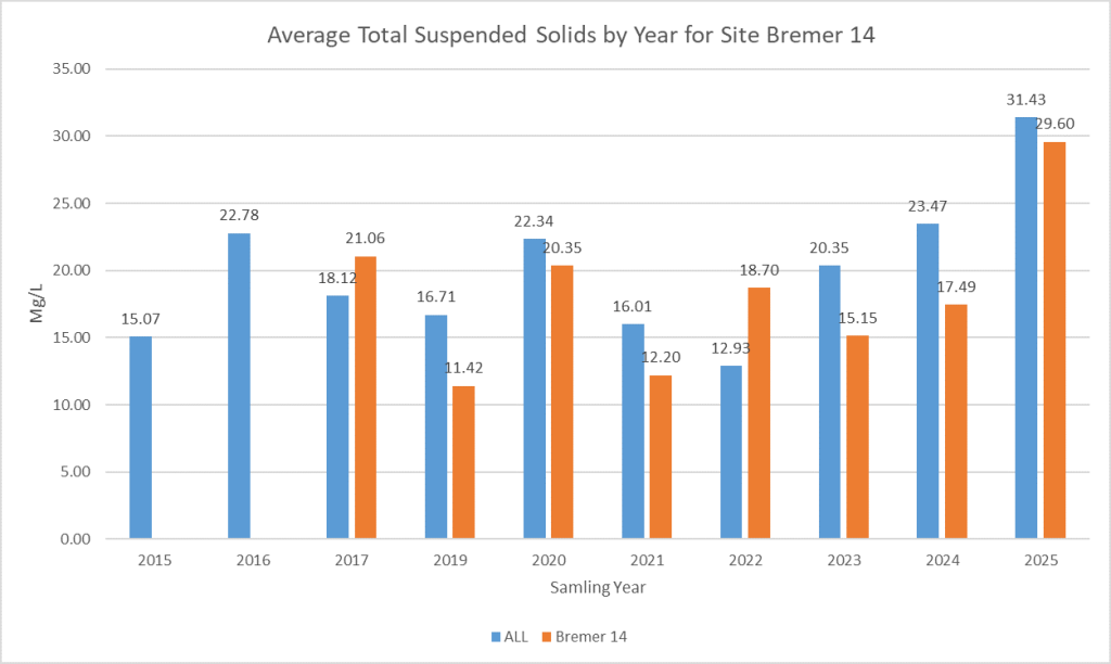 Click on the site of interest to explore nitrate, phosphate, total suspended solids, and bacteria data for that site. The tables associated with each site average results from each sampling year compared to the watershed-wide average.