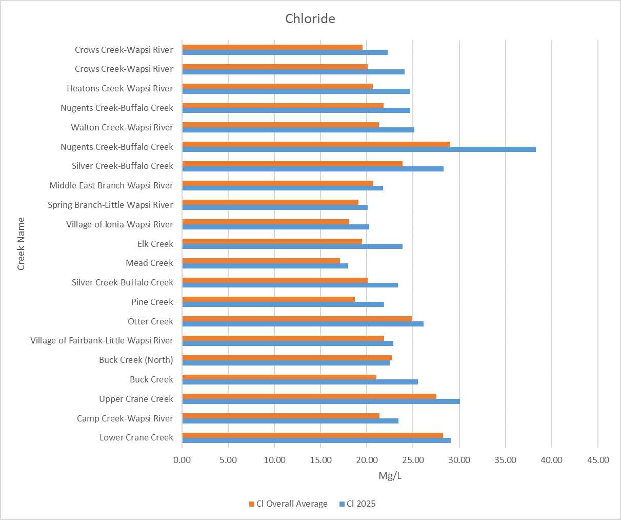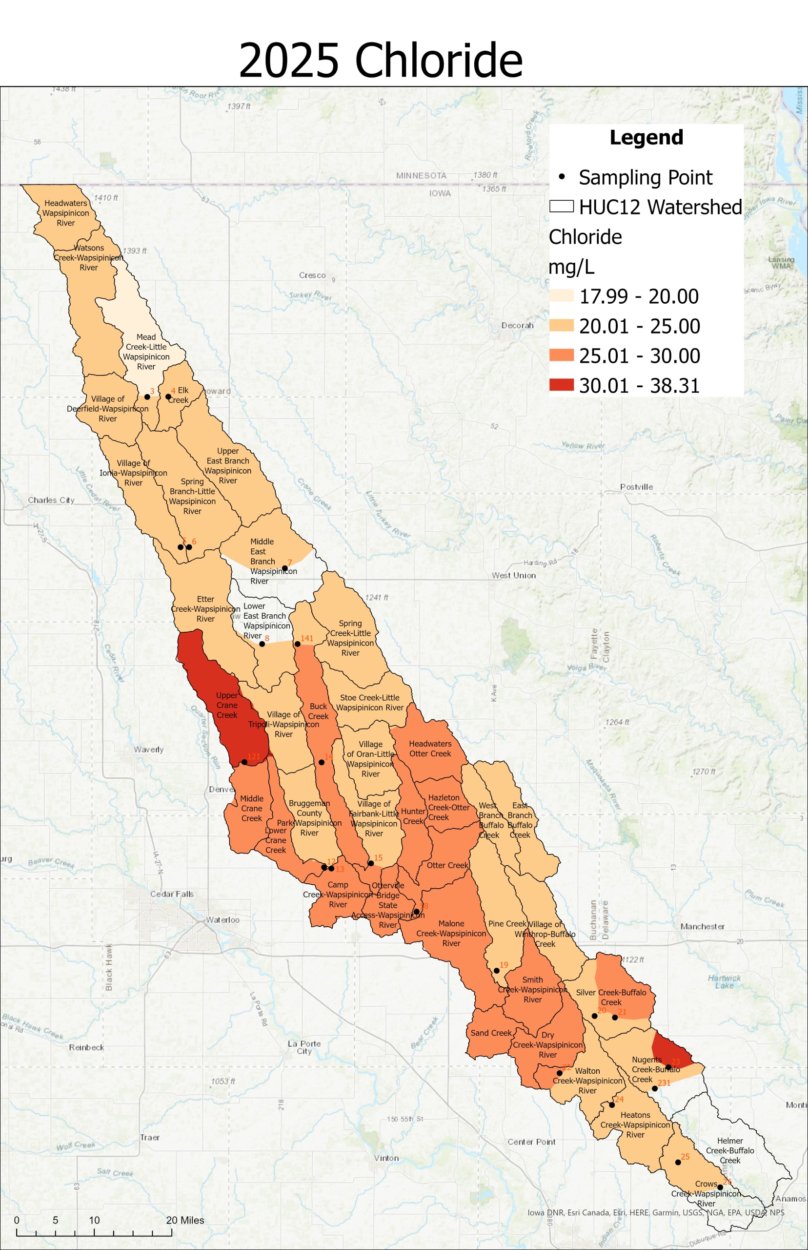 Chloride is a chemical element found in salts, which tend to dissolve easily in water. In natural waters, elevated levels of chloride may indicate inputs of human or animal waste, or inputs from fertilizers, many of which contain salts. During winter months, elevated chloride levels in streams may occur as a result of road salt runoff to nearby streams. The amount of chloride dissolved in water is expressed in milligrams per liter of water (mg/L). Average chloride concentrations for Iowa streams range from 16 to 29 mg/L. The Iowa DNR released, Water Quality Standards Review: Chloride, Sulfate and Total Dissolved Solids a study examining the effects of sulfate and chloride on aquatic ecosystems in Iowa.