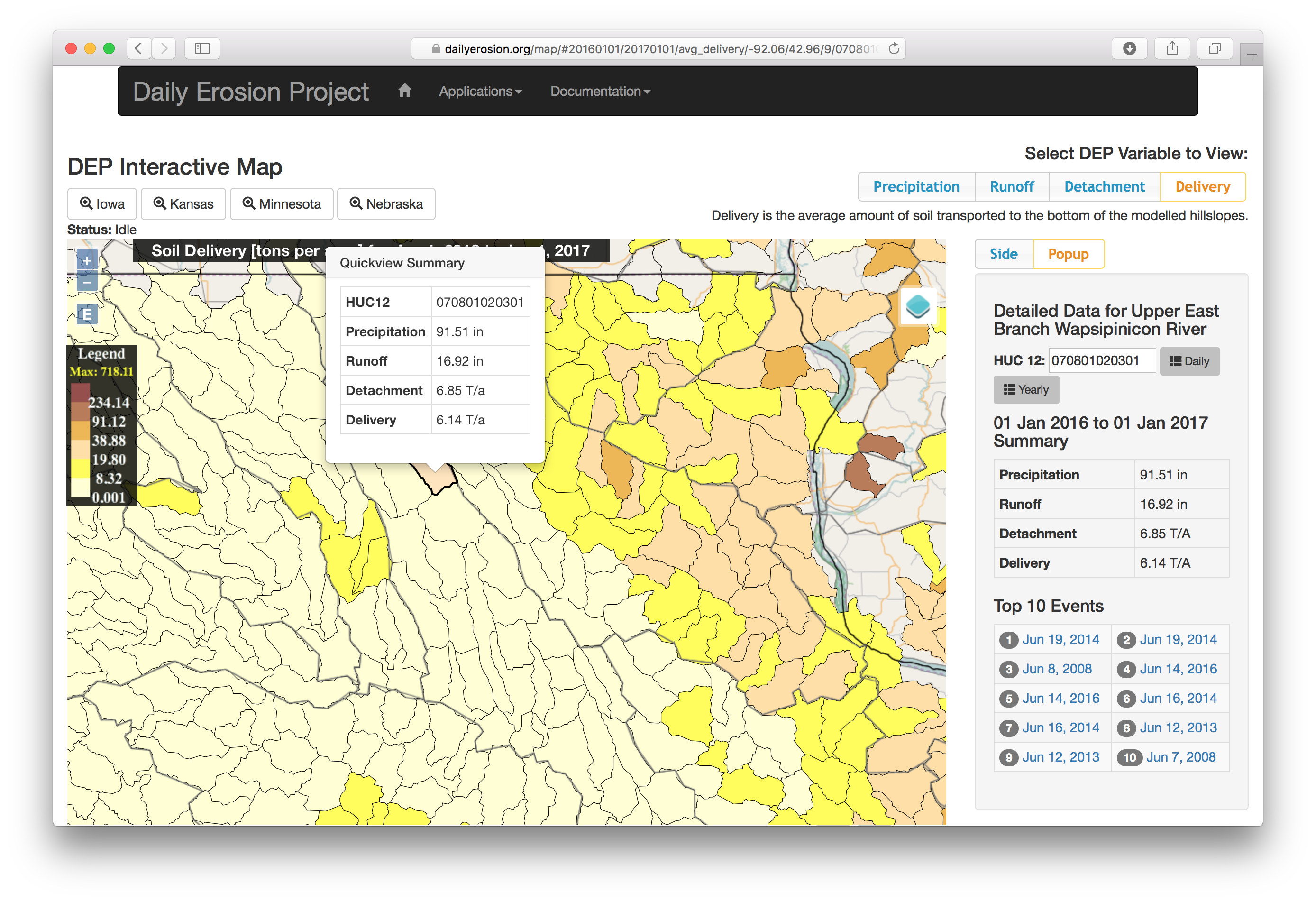 It is an update and expansion to the Iowa Daily Erosion Project (Cruse et al., 2006) that is designed to further investigate large scale erosion dynamics while maintaining hillslope level input resolution. The DEP has a climate database extending from 2007 to the present day, enabling investigation of single event and single year runoff and soil erosion dynamics over a large time range and spatial extent.